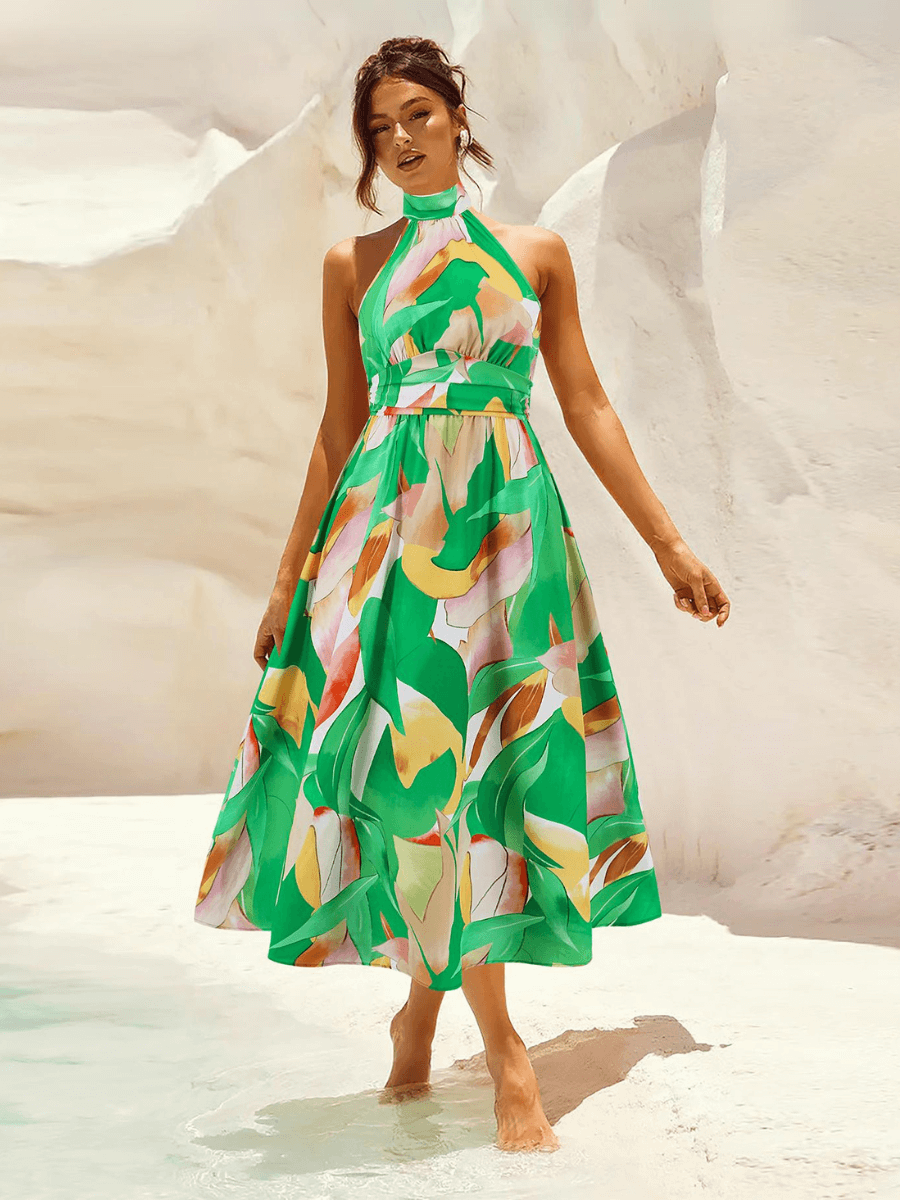 Addison Halter Neck Floral Print Maxi Dress - Green
