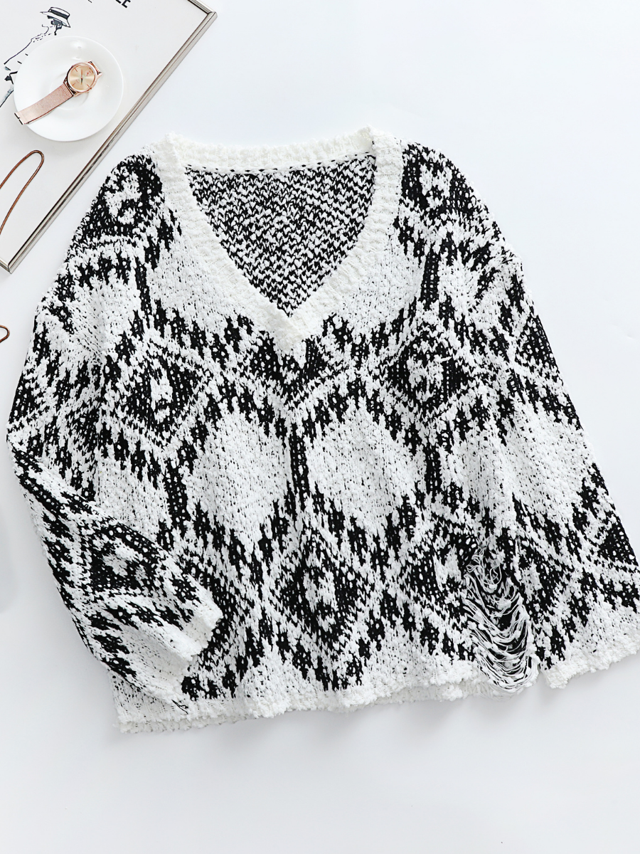 Alemery | Geometric Pattern Ripped Side Hem Sweater - Black