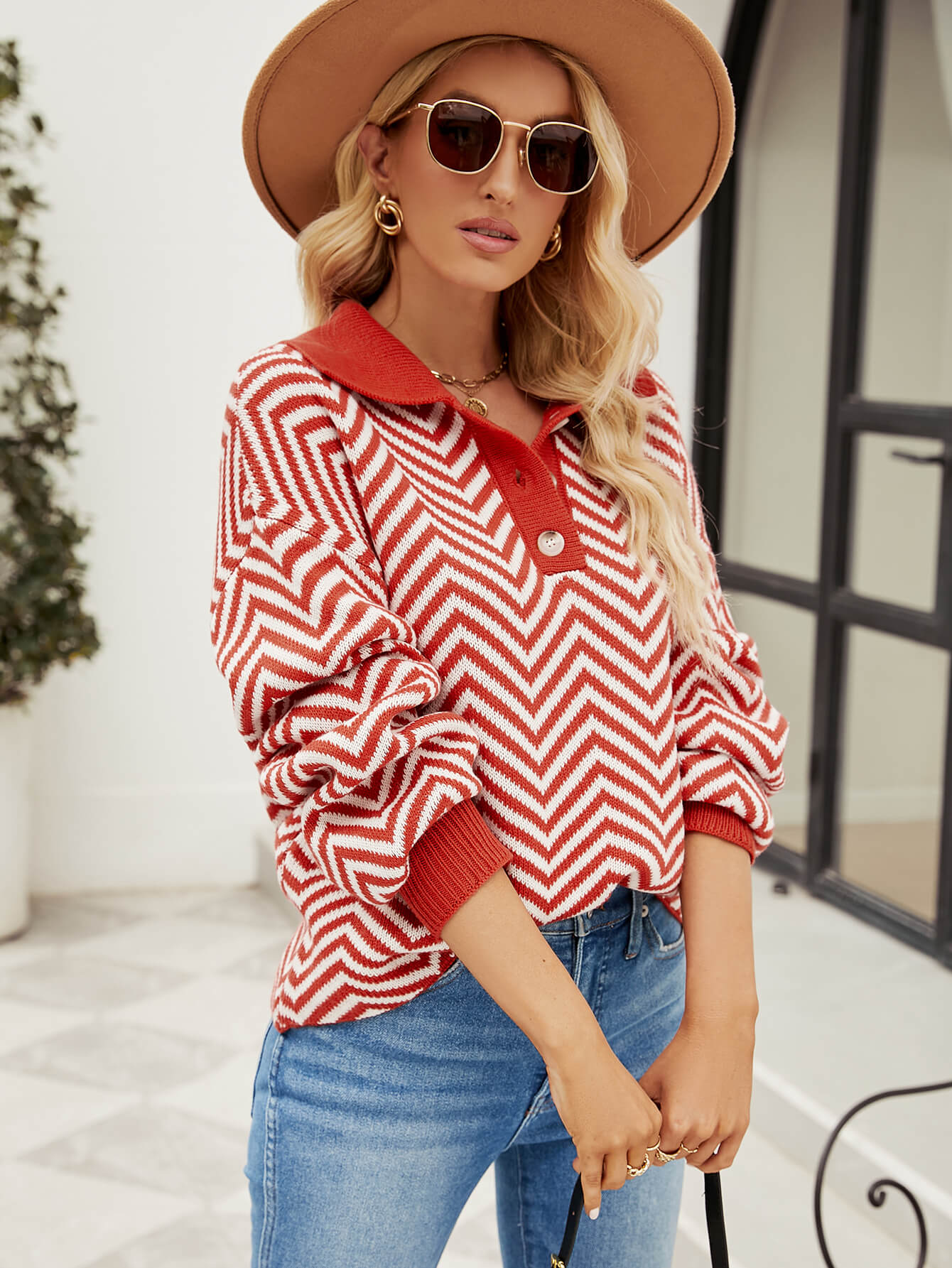 Benji Zig Zag Striped Batwing Sleeve Sweater - Red