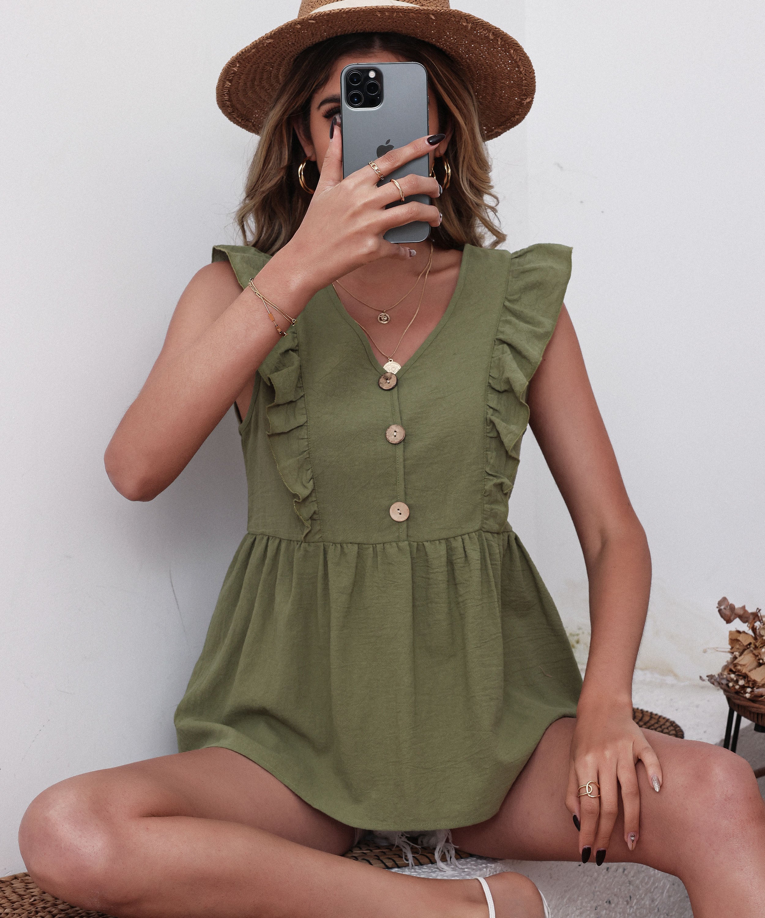 Our Aully Top comes in a army green tone color. This features a V neckline. Short ruffle sleeves cinched at the elbows and front button. The relaxed fit pairs beautifully with shorts or jeans. tan sandals. and minimal gold accessories!