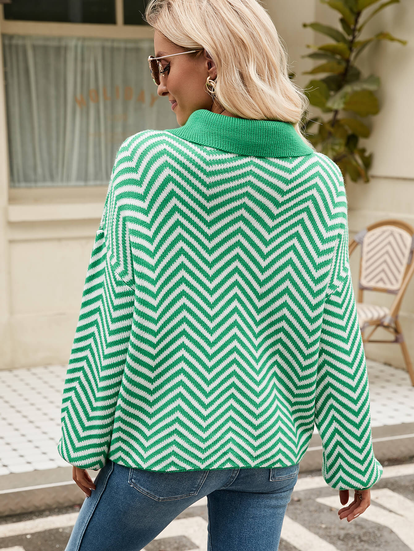Benji Zig Zag Striped Batwing Sleeve Sweater - Green