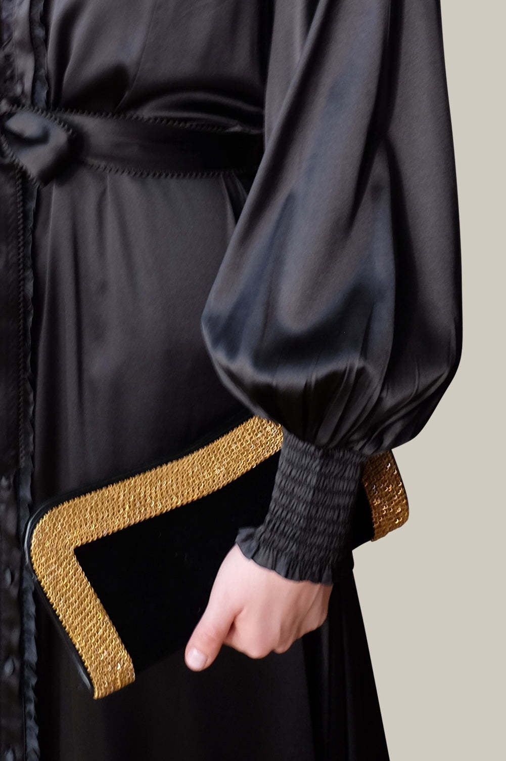 Black Fabric: Velvet. White Fabric: Satin. Metal Chain Strap.