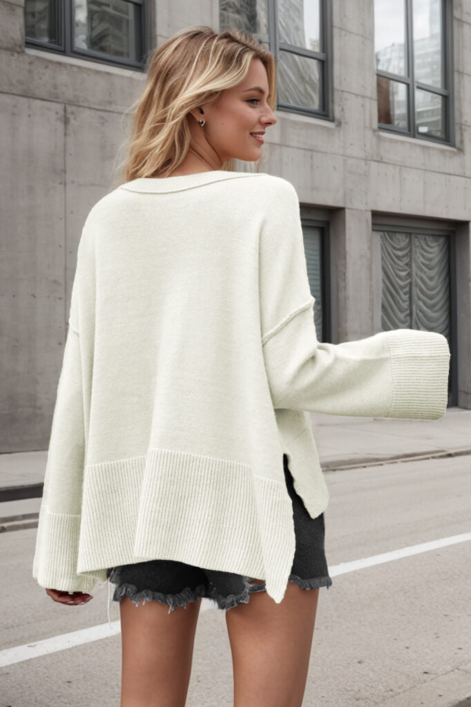 - Feature: Crew ribbed neckline. Cuffs & hem. Outer sew detail. Long wide sleeves. Side slits. Oversized Relaxed Fit. Maternity friendly.