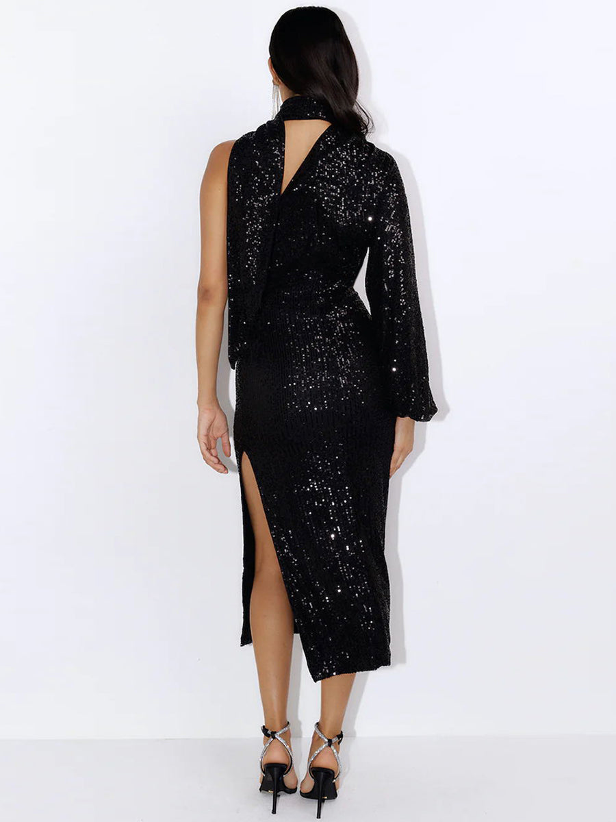 Layton Sequin One-Shoulder Midi Dress - Black