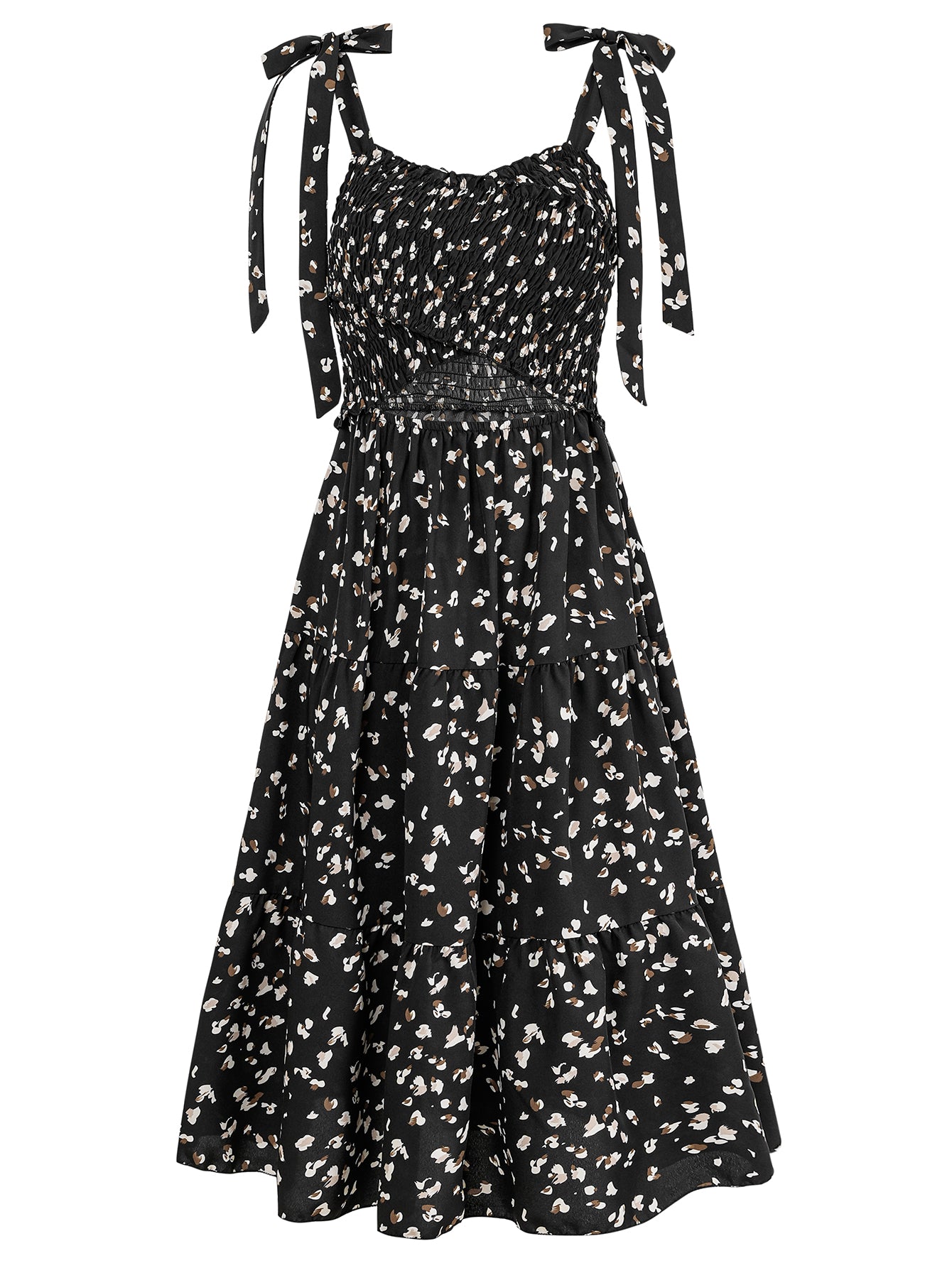 - Feature: Sleeveless with shoulder ties. Smock Bodic. Midi length. Front Cutout Waist. Stretchy Fabrication.
