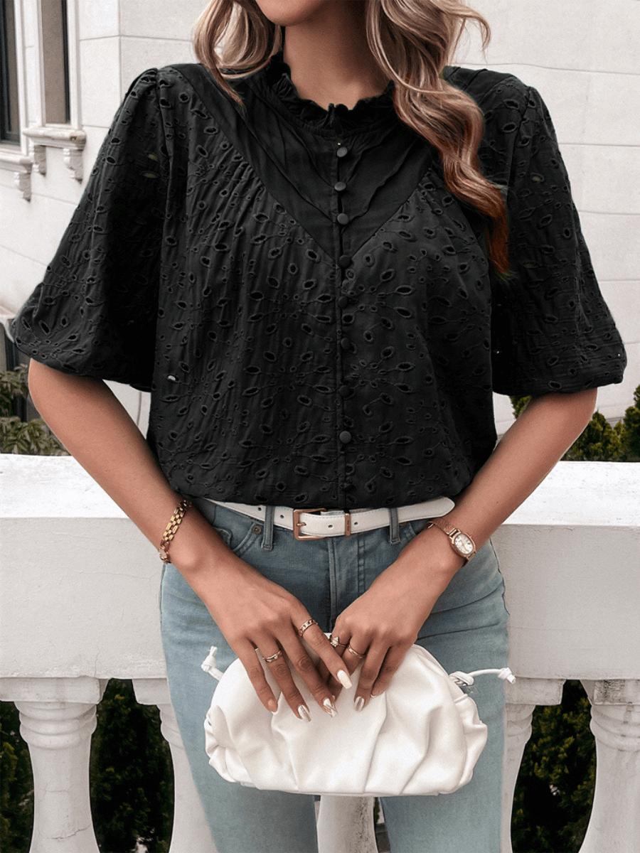 Unleash your inner fashionista with the Ventura Eyelet Short Sleeve Blouse. This stylish top features delicate eyelet detailing and a flattering short sleeve design that will elevate any outfit. Embrace your unique style with this must-have blouse!